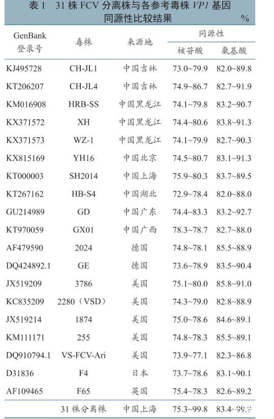 表1 31株FCV分離株與各參考毒株VP1基因同源性比較結(jié)果%