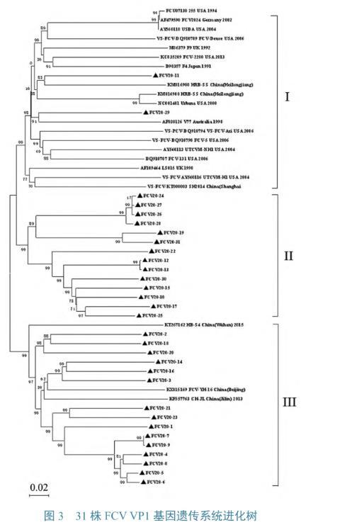 2.2.2VP1基因同源性和遺傳進(jìn)化分析FCVVP1序列比對分析結(jié)果(表1)顯示:31株分離株間的核苷酸同源性為75.3%~99.8%,與國內(nèi)FCV疫苗株255的同源性為74.8%~78.3%,與國外FCV疫苗株F4的同源性為73.7%~78.6%,與跛行綜合征株2280的同源性為74.3%~79.0%,與2016年發(fā)現(xiàn)的美國超強(qiáng)毒株VS-FCV-Ari的同源性為73.9%~77.1%。同國際分離株相比,31株分離株與美國3786株的同源性較高,與美國超強(qiáng)毒株VS-FCV-Ari的同源性最低。與國內(nèi)分離株相比,與國內(nèi)吉林株CH-JL4的同源性最高,與湖北HB-S4株的同源性最低,與2014年上海SH2014株的同源性為75.9%~80.3%。相應(yīng)的氨基酸序列分析表明,31株分離株與255疫苗株的同源性為85.5%~89.1%,與F4疫苗株的同源性為83.1%~90.1%,與超強(qiáng)毒株VS-FCV-Ari的同源性為82.3%~86.8%,與上海SH2014株的同源性為83.7%~89.5%。FCVVP1基因遺傳進(jìn)化分析結(jié)果(圖3)顯示:31個(gè)分離株總體上可以劃分為3個(gè)分支。第一分支只包括FCV20-11和FCV20-29,其與疫苗株、超強(qiáng)毒株和國內(nèi)外的一些分離株親緣關(guān)系較近,形成一個(gè)獨(dú)立分支,進(jìn)化關(guān)系最為復(fù)雜,來源也最為廣泛;第二分支只包含14株分離株,遺傳進(jìn)化關(guān)系最為簡單,已經(jīng)形成獨(dú)立的遺傳進(jìn)化譜系;第三分支包括15株分離株及其他3株國內(nèi)毒株。結(jié)果表明,F(xiàn)CV進(jìn)化關(guān)系較為復(fù)雜,且本地分離株具有多樣性。