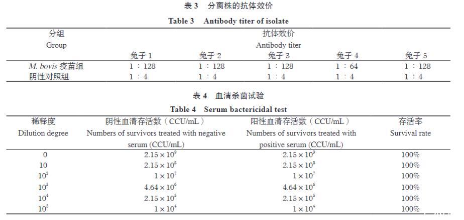 M.bovis疫苗免疫組的5只兔子,二免后14天血清抗體效價均顯著升高,其中4只達(dá)到≥1:128(終點(diǎn)效價為1:128),1只為1:64。所有免疫兔子的抗體效價均≥1:64。