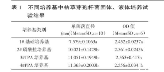 不同培養(yǎng)基中枯草芽孢桿菌培養(yǎng)結(jié)果見表1。