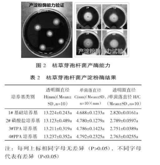 由圖2、表2可知,從1#、2#、3#、4#固體培養(yǎng)基中挑取的枯草芽孢桿菌在淀粉培養(yǎng)基上的透明圈直徑、產(chǎn)淀粉酶菌落直徑、產(chǎn)淀粉酶透明圈直徑/菌落直徑值上不存在顯著性差異,由此說明培養(yǎng)基中添加適量磷酸鹽、TPA和PPA對(duì)枯草芽孢產(chǎn)淀粉酶能力不會(huì)產(chǎn)生抑制。