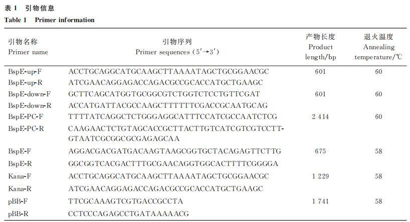 將BspE基因上、下游同源臂片段按照1:1比例混合后作為模板,利用引物BspE-up-F、BspE-down-R,通過融合PCR技術(shù)進(jìn)行擴(kuò)增;將BspE和kana基因片段按照1:1比例混合后作為模板,利用引物BspE-F、Kana-R,通過融合PCR技術(shù)進(jìn)行擴(kuò)增。PCR反應(yīng)體系和程序按1.2.3進(jìn)行。反應(yīng)完成后對(duì)DNA片段進(jìn)行膠回收,于-20℃保存?zhèn)溆谩?