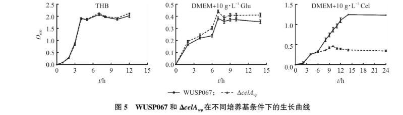 圖5 WUSP067和ΔcelAwp在不同培養(yǎng)基條件下的生長曲線
