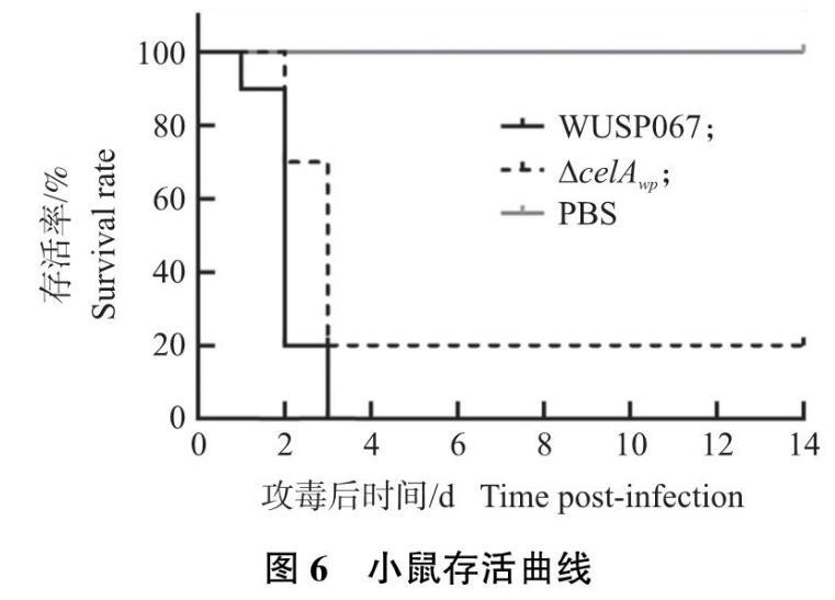 以ICR斷奶仔鼠為感染模型進行WUSP067野生株和缺失株ΔcelAwp的毒力試驗。結果如圖6所示,攻毒劑量為每鼠3×108 CFU,攻毒后野生株攻毒小鼠3日內(nèi)全部死亡,缺失株ΔcelAwp攻毒小鼠死亡時間延后,14 d后存活率20%,與野生株相比差異顯著(P<0.05)。此結果表明,celAwp基因影響巴氏鏈球菌WUSP067的致病性,缺失該基因其毒力減弱。