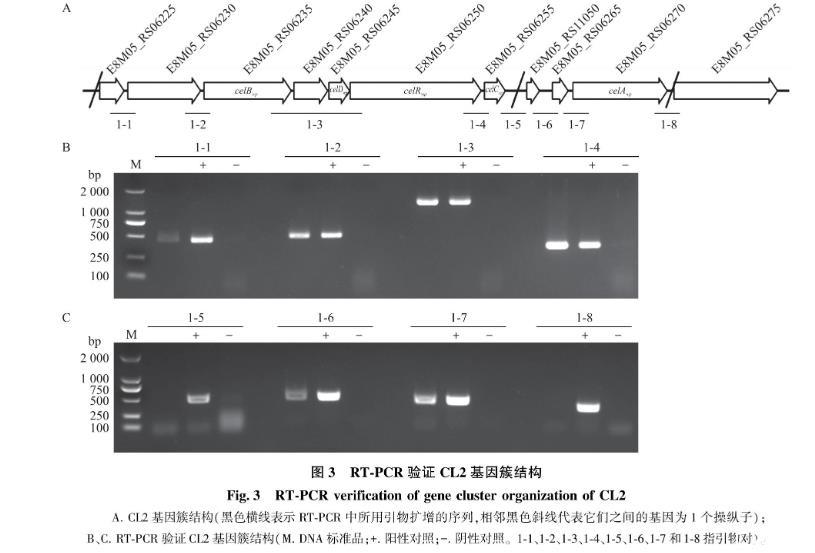 使用引物1-1-F/R、1-2-F/R、1-3-F/R、1-4-F/R擴增出長度分別為451、494、1 280 和350 bp的片段(圖3-A、B); 使用引物1-6-F/R和1-7-F/R擴增出長度分別為501和439 bp的片段,而使用引物1-5F/R和1-8-F/R不能擴增出相應的條帶(圖3-C)。這表明CL2由2個操縱子組成,即E8M05_RS06225—E8M05_RS06255和E8M05_RS11050—E8M05_RS06270。