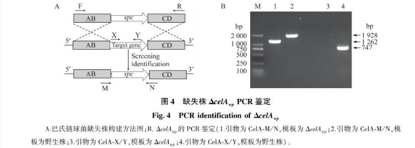 采用信號肽同源重組的方法構建ΔcelAwp(圖4-A)。使用引物CelA-M/N,以缺失株ΔcelAwp為模板,擴增出大小為1 262 bp片段,而以野生株為模板,擴增出大小為1 928 bp片段; 使用引物CelA-X/Y,以缺失株ΔcelAwp為模板時,不能擴增出相應片段,而以野生株為模板時,可以擴增出大小為747 bp的片段(圖4-B)。上述結果表明缺失株ΔcelAwp構建成功。