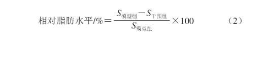 孵育結(jié)束后使用E3養(yǎng)殖水沖洗幼魚,將幼魚收集于1.5 mL離心管中,加入1 mL 4%多聚甲醛溶液,4 ℃固定1 d。將離心管中固定的幼魚倒入24 孔板中,E3養(yǎng)殖水沖洗2 次,用不同體積分?jǐn)?shù)的1,2-丙二醇溶液按以下順序進(jìn)行滲透:25% 1,2-丙二醇溶液處理25 min→50%1,2-丙二醇溶液處理25 min→75% 1,2-丙二醇溶液處理25 min→100% 1,2-丙二醇溶液處理25 min。加入質(zhì)量分?jǐn)?shù)為0.5%油紅O染液2 mL(幼魚完全浸沒),錫紙避光,室溫染色過夜。洗掉染液,加入體積分?jǐn)?shù)為100% 1,2-丙二醇溶液,去背景色20 min(在顯微鏡下觀察去背景的效果)。在顯微鏡下拍照觀察斑馬魚幼魚染色情況(脂肪細(xì)胞和肝臟脂肪變性染色呈紅色)。采用ImageJ 6.0軟件進(jìn)行圖像分析并采集數(shù)據(jù),分析統(tǒng)計(jì)斑馬魚尾部血管血脂光密度總和(S),根據(jù)光密度總和的統(tǒng)計(jì)學(xué)結(jié)果按式(2)計(jì)算相對(duì)脂肪水平,以評(píng)價(jià)動(dòng)物雙岐桿菌NX-6的降血脂作用。