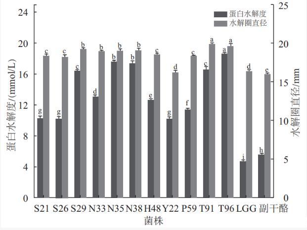 乳桿菌生長于脫脂乳培養(yǎng)基中時能分解乳中蛋白質(zhì)生成游離氨基酸,不同菌株生成游離氨基酸的能力不同。由圖2可見,11株菌株均產(chǎn)生較為明顯的透明圈,透明圈直徑最大的是菌株T91和T95,均超過19 mm,但它們之間無統(tǒng)計學(xué)差異(P>0.05)。蛋白質(zhì)水解度分析結(jié)果表明菌株T95的蛋白水解度在所有菌株中最高,可達(dá)到18.61±0.38 mmol/L,且顯著高于其他菌株(P<0.05),其次是菌株N35、N38、T91和S29。所有試驗菌株的蛋白水解能力均高于對照菌株LGG和LP_6110。本試驗測定結(jié)果略高于張爽等測定69株菌株L-Leu的蛋白水解度,其測定范圍在1.89±0.14 mmol/L~11.60±0.52 mmol/L。