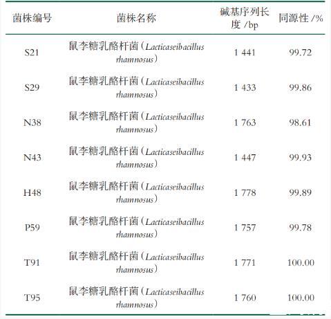 將得到的8株菌進(jìn)行PCR擴增和瓊脂糖凝膠電泳,電泳條帶明亮清晰且分子質(zhì)量皆在1 500 bp左右,符合測序要求。將擴增產(chǎn)物進(jìn)行測序并拼接,在NCBI數(shù)據(jù)庫中進(jìn)行比對(http://www.ncbi.nlm.nin.gov/BLAST)。序列比對結(jié)果見表1。所有菌均為鼠李糖乳酪桿菌(Lacticaseibacillus rhamnosus)。