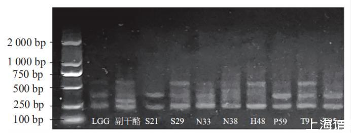 RAPD技術(shù)已經(jīng)在微生物基因型識別領(lǐng)域得到廣泛運用。為避免篩選出的菌株為同一菌株,以LGG和LP_6110作為對照,采用S23引物對上述試驗得到的11株菌進(jìn)行PCR擴增,剔除條帶和來源相同的菌株,最終挑選出8株性狀各不相同的乳桿菌,得到RAPD圖譜見圖3。由圖3可見,不同菌株之間的電泳圖有差異,菌株S21和P59比較相似,但來源于不同樣品,在光學(xué)顯微鏡下菌體形態(tài)差異較大,因此也將2株菌進(jìn)行了保留。