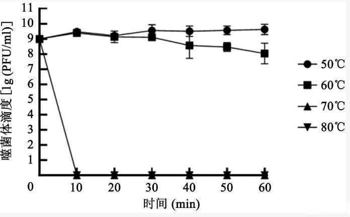 (1)噬菌體熱穩(wěn)定性:噬菌體JD01在50℃時,保持較好的活性,在暴露于60℃60 min時,噬菌體活性下降了一個數(shù)量級。70℃時,在10 min內急劇下降直至失活,結果表明噬菌體JD01對高溫敏感(圖4)。