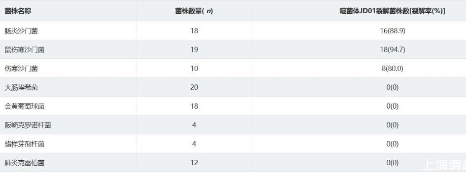 3.噬菌體宿主范圍的測定結果:以18株腸炎沙門菌、19株鼠傷寒沙門菌、10株傷寒沙門菌、20株大腸埃希菌、18株金黃葡萄球菌、4株阪崎克羅諾桿菌、4株蠟樣芽孢桿菌以及12株肺炎克雷伯菌為測試菌株,共計105株,測定噬菌體JD01的宿主范圍。從表2可見,噬菌體JD01僅裂解沙門菌屬的細菌,其對腸炎沙門菌、鼠傷寒沙門菌和傷寒沙門菌裂解率分別為88.9%(16/18)、94.7%(18/19)和80.0%(8/10),而對非沙門菌屬的細菌如大腸埃希菌、金黃葡萄球菌、阪崎克羅諾桿菌、蠟樣芽孢桿菌和肺炎克雷伯菌均不裂解。
