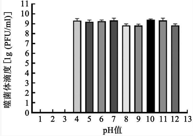 (2)噬菌體pH穩(wěn)定性:結果如圖5所示,噬菌體JD01在pH4.0~12.0條件下仍保持原來較高的滴度,在pH<4.0或pH>12.0的條件下完全失活。