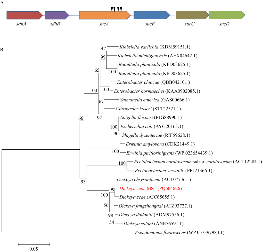圖1 Tn5轉(zhuǎn)座子插入的sucA基因及其系統(tǒng)發(fā)育樹分析A:示意圖顯示Tn5轉(zhuǎn)座子插入D.zeae MS1 sucA基因的不同位點(diǎn),黑色箭頭從左至右分別表示突變體XT20、C45、XT120和Q63的插入位點(diǎn);B:基于SucA蛋白序列的系統(tǒng)發(fā)育樹分析,菌株拉丁名后括號(hào)內(nèi)是GenBank序列號(hào),分支點(diǎn)上的數(shù)字代表該其bootstrap值(以百分比形式展示),標(biāo)尺數(shù)字代表該長度的分支所代表的基因遺傳變異度。
