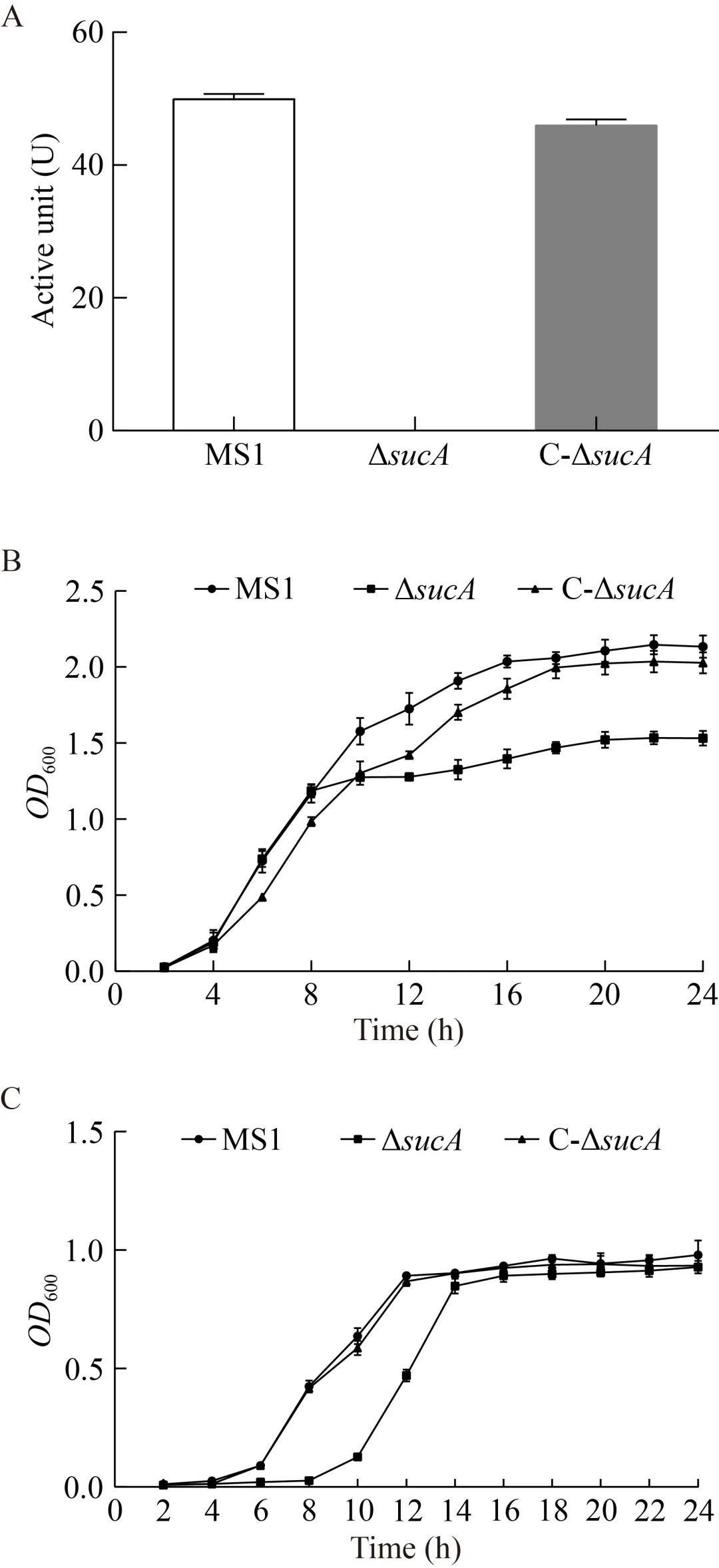 基因敲除突變體ΔsucA在細(xì)菌生長曲線上受到一定程度的影響,但是其α-KGDH活性完全喪失。