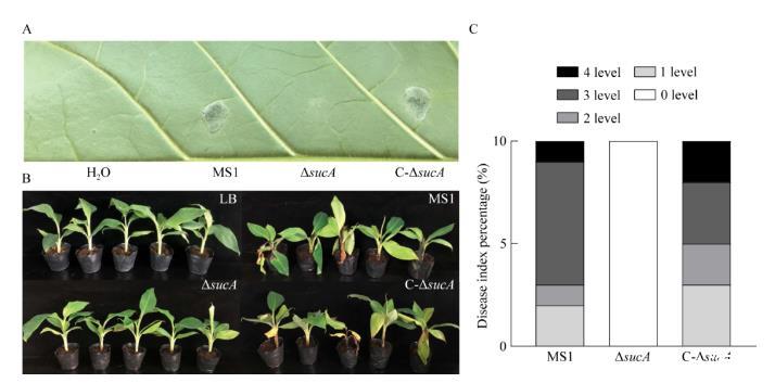 在對(duì)非寄主煙草的過敏性反應(yīng)上,D.zeae MS1野生型在浸潤接種至煙草葉片后可產(chǎn)生組織壞死等典型的過敏性反應(yīng),接種ΔsucA的煙草葉片僅表現(xiàn)出微弱的過敏性反應(yīng),兩者間的反應(yīng)差異明顯(圖5A);C-ΔsucA可恢復(fù)突變體在煙草上誘導(dǎo)產(chǎn)生過敏性反應(yīng)的能力。在對(duì)寄主香蕉的致病性反應(yīng)上,接種D.zeae MS1野生型和C-ΔsucA的香蕉幼苗在3 d后均可呈現(xiàn)出細(xì)菌性軟腐病癥狀,具體表現(xiàn)為假莖基部變褐和新葉開始失綠;在接種7 d后,多數(shù)香蕉幼苗均已呈現(xiàn)明顯的癥狀,具體表現(xiàn)為假莖腐爛、變黑并出現(xiàn)水漬狀病斑,新葉也表現(xiàn)出明顯枯萎甚至整葉壞死(圖5B)。相反地,接種ΔsucA的香蕉幼苗在7 d后仍然表現(xiàn)整株健康,在接種處未出現(xiàn)明顯的細(xì)菌性軟腐病癥狀(圖5B)。接種7 d后,香蕉幼苗發(fā)病嚴(yán)重程度的等級(jí)劃分表明野生型和回補(bǔ)菌株可引起全部已接種幼苗出現(xiàn)癥狀,7株接種野生型的幼苗達(dá)到了3級(jí)以上的癥狀,5株接種回補(bǔ)菌株的幼苗達(dá)到了3級(jí)以上的癥狀;接種ΔsucA的幼苗則均未出現(xiàn)癥狀(0級(jí))(圖5C)。接種野生型和回補(bǔ)菌株的香蕉幼苗的病情指數(shù)分別為62.50%和60.00%,接種ΔsucA的幼苗的病情指數(shù)為0。