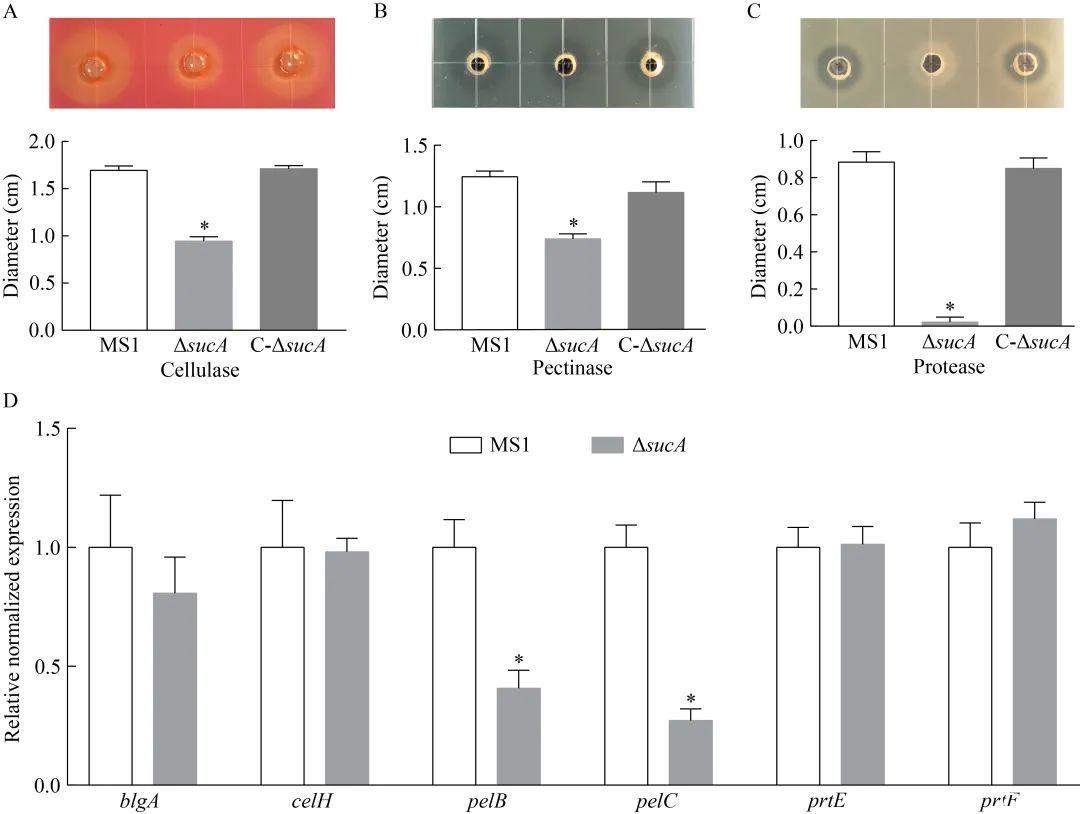 相較于D.zeae MS1野生型,ΔsucA在測(cè)定平板培養(yǎng)后的Cel、Pel和Prt的活性分別降低了44.25%、40.60%和97.48%,差異達(dá)到顯著水平(P<0.05);C-ΔsucA菌株則將PCWDEs活性恢復(fù)至與野生型相似的水平(圖3A?3C)。sucA基因?qū)τ谙憬都?xì)菌性軟腐病菌分泌PCWDEs具有重要作用,RT-qPCR分析也表明sucA基因突變可影響編碼PCWDEs基因的轉(zhuǎn)錄表達(dá)。相較野生型,編碼Pel的基因pelB和pelC在ΔsucA中的轉(zhuǎn)錄水平顯著降低;但是,sucA基因的突變對(duì)編碼Cel的bglA和celH基因、編碼Prt的prtE和prtF基因的轉(zhuǎn)錄表達(dá)均不產(chǎn)生明顯的抑制作用(圖3D)。