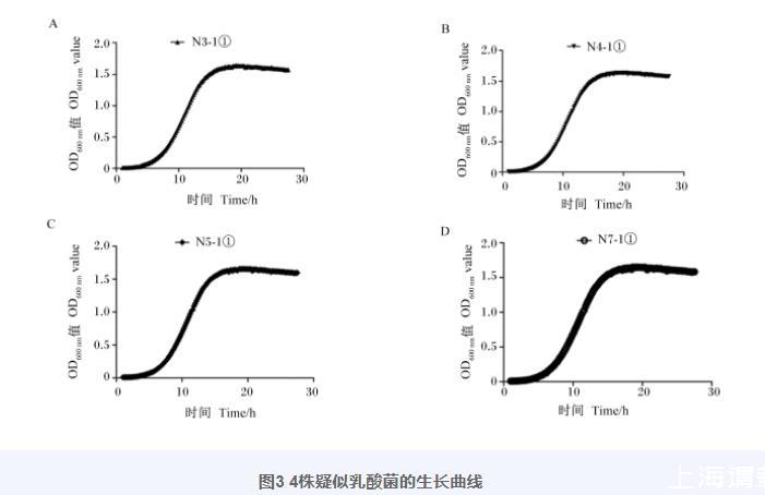 圖3 4株疑似乳酸菌的生長曲線A:N3-1①28 h內OD600 nm值變化;B:N4-1①28 h內OD600 nm值變化;C:N5-1①28 h內OD600 nm值變化;D:N7-1①28 h內OD600 nm值變化。