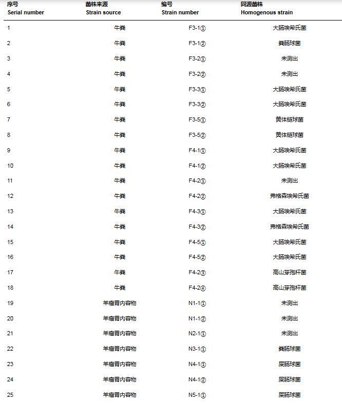 將從牛糞中分離的18株、從羊瘤胃內容物中分離的9株和從青貯飼料中分離的2株共29株細菌的16S rDNA進行擴增,擴增產物的電泳圖見圖1。將這29株分離菌株的16S rDNA序列在NCBI數據庫進行Blast序列比對,選取序列同源性最高的菌株作為測序菌株的疑似菌株,其中有11株疑似乳酸菌(表1)。