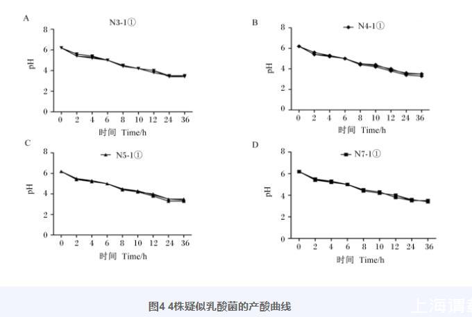 產酸曲線(圖4)表明,N3-1①、N4-1①、N5-1①、N7-1①接種在MRS肉湯培養(yǎng)基中,0 h時pH均為6.2,培養(yǎng)24 h后,pH均在3.5左右,此時各菌株產酸能力已到達平臺期;繼續(xù)培養(yǎng)至36 h,pH沒有發(fā)生變化,表明乳酸菌生長達到穩(wěn)定期后,其產酸能力不再隨時間的延長而增加。