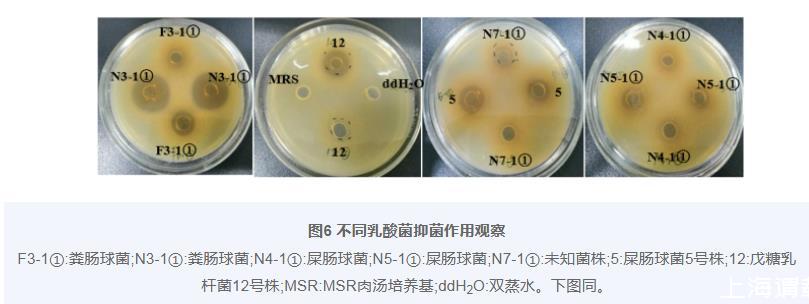 圖6不同乳酸菌抑菌作用觀察F3-1①:糞腸球菌;N3-1①:糞腸球菌;N4-1①:屎腸球菌;N5-1①:屎腸球菌;N7-1①:未知菌株;5:屎腸球菌5號株;12:戊糖乳桿菌12號株;MSR:MSR肉湯培養(yǎng)基;ddH2O:雙蒸水。下圖同。