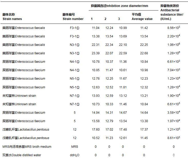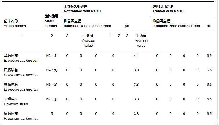 牛津杯雙層平板法試驗結(jié)果表明,從羊瘤胃內(nèi)容物中分離的糞腸球菌N3-1①具有最強的抑菌活性,其他試驗菌株培養(yǎng)24 h后的無菌發(fā)酵上清液所形成的抑菌圈直徑較小,具有一定的抑菌活性。何江波等從羊瘤胃內(nèi)容物中分離出22株乳酸菌(包括戊糖乳桿菌、糞腸球菌、蒙氏腸球菌、海氏腸球菌等),在排除酸效應(yīng)后,所有菌株發(fā)酵上清液均未檢測到抑菌活性。本試驗所得結(jié)果與上述研究結(jié)果相似。