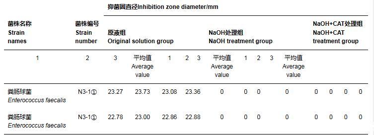 牛津杯試驗表明,在分離的乳酸菌中N3-1①對金黃色葡萄球菌ATCC29213株具有最強的抑菌活性。在此基礎(chǔ)上,通過制備不同處理下的N3-1①無菌發(fā)酵上清液,開展進一步抑菌試驗,探究乳酸菌所產(chǎn)抑菌物質(zhì)的種類。由圖7和表3可知,N3-1①的無菌發(fā)酵上清液經(jīng)冷凍干燥、1/10體積濃縮后表現(xiàn)出較強的抑菌活性,抑菌圈直徑達23.36 mm;經(jīng)NaOH調(diào)pH至6.5左右,抑菌圈消失,表明發(fā)揮抑菌作用的活性物質(zhì)可能為有機酸類等酸性物質(zhì);本試驗未觀察到H2O2在NaOH對無菌發(fā)酵上清液的處理中發(fā)揮進一步的作用。