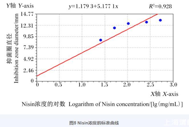 Nisin濃度的標準曲線如圖5所示,線性擬合方程為:Y=1.179 3+5.177 1X(R2=0.928)。根據(jù)此方程可計算抑菌試驗中乳酸菌無菌發(fā)酵上清液所對應(yīng)的細菌素當量對數(shù)值[lg(mg/mL)]。由于乳酸菌無菌發(fā)酵上清液經(jīng)過10倍濃縮,且商品化Nisin效價單位為900 IU/mg,最終計算公式為: